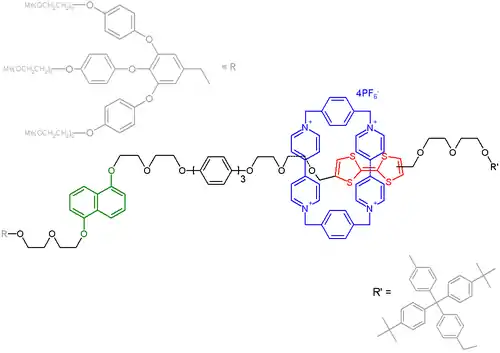 In 2007 molecular shuttles are utilized in an experimental DRAM circuit.[18] The device consists of 400 bottom silicon nanowire electrodes (16 nanometer (nm) wide at 33 nm intervals) crossed by another 400 titanium top-nanowires with similar dimensions sandwiching a monolayer of a bistable rotaxane depicted below: