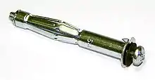 A molly or molly bolt (often misspelled moly[1]) is a type of screw fastener that fastens objects to plaster or gypsum board hollow walls by providing an anchor to be lodged inside a hole and expanded once in position. Larger sizes permit reasonably heavy objects, such as shelving, flatscreen-TV mounts or central-heating radiators to be attached to drywall in locations where there is no stud behind the drywall. For heavy objects, multiple molly bolts may be required.