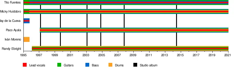 The band began in 1995 when two friends, Tito Fuentes (guitar) and Micky "Chicho" Huidobro (bass), started playing together. Javier de la "J" Cueva and Iván Jared "La Quesadillera" Moreno joined them in September of that year, becoming the first line up for the band. Moreno would eventually leave and be replaced by Randy Ebright, the only American member of the band, in October 1995.[4] In February 1996, de la Cueva would also leave. He was replaced by Paco Ayala, establishing the four-member lineup that has remained consistent over the years.