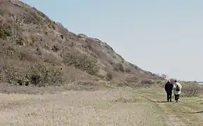 Jernhatten (English: The Iron Hat) is a view point on the coast of the Kattegat sea, in the eastern parts of the park. The cliff above the sea has a drop of 49 metres (161 ft). The formation is very hard and not erodible by sea waves. From the car parking area, the site is approached along a track passing through the beechwood of Troldeskoven (English: The Troll Forest). The hill offers panoramic views of the surrounding area and across the Kattegat sea with the small island of Hjelm in the southeast. The path to Jernhatten leads onwards to the hills of Hyllested Bjerge, the forest of Bagskoven and down to the beach. The seafloor along the coast here, comprise a cold water stony reef with an extensive kelp forest known as the Blak, offering good snorkeling opportunities in the summer months.[5] Harbour porpoises may be visible as well.[11][12]