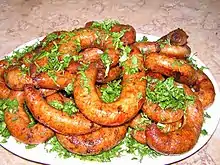 Mombar (in ِArabic: ممبار) or sheep fawaregh (in ِArabic: فوارغ) is a kind of Arab sausage dish especially popular in Egypt.[1][2] Syria,[3] Algeria, Tunisia,[4] and Libya.[5] It is made from sheep casing stuffed with a rice and meat mixture and deep fried.