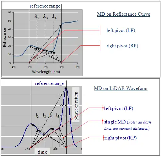 Assume that a curve (reflectance or absorption curve or backscattered waveform) is displayed in Cartesian coordinates with the abscissa displaying the wavelength λ or time lapse t and the ordinate displaying the reflectance ρ or the backscattered power p. Let the subscript LP denote the left pivot (located in a shorter wavelength for the spectral curve and earlier temporal reference point for the waveform) and subscript RP denote the right pivot (located in a longer wavelength for the spectral curve and later temporal reference point for the waveform). Let λLP and λRP be the wavelength locations observed at the left and right pivots for a reflectance data, respectively, where left (right) indicates a shorter (longer) wavelength. Let tLP and tRP be the time value observed at the left and right pivots for a waveform data, respectively, where left (right) indicates an earlier (later) time. The proposed MD approach can be described in a set of equations.