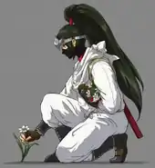 Momiji is a tall, young girl with amber eyes and long black hair tied in a ponytail. Her measurements are B92 / W58 / H88 and she is 21-years-old in DOAX3.[32] Originally she wore a white Hayabusa ninja training[33] outfit with greenish-black hair, but starting in Sigma 2 she has black hair. Momiji usually wears minimal armor for mobility.[34] By Sigma 2, her main[35] costume became a revealing[36] battle-priestess outfit where the colors red and white represent dragon's flame and purification.[33] Her alternative costumes in the game, "designed for action and style,"[37] include a variation of her shrine maiden costume that "mixes a skirt with a traditional ceremonial top," an "easy-to-move clothing for combat whose violet design still maintains a sense of serenity," and a "traditional clothing for those taking part in secular festivals"[38] that is very similar to Kasumi's original costume in the early Dead or Alive games. Another costume was first made available as part of a paid DLC,[39] and more arrived with Razor's Edge.[40]