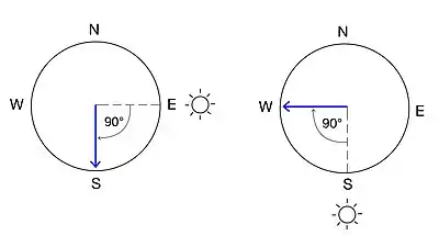 When monarchs entrained to laboratory light-dark cycles were placed in flight simulators, or recording containers in which tethered butterflies are allowed to freely fly in the horizontal plane in all directions, migratory monarchs could integrate current sunlight conditions with their internal time of day to determine and consistently show a southward preferred direction of travel.[94] However, when these monarchs were placed into flight simulators with six hour clock advances or delays, preferred direction of travel changed due to interference with the time-compensated sun compass.[94][95] Monarchs orient to the sun based on their internal time of day, so drastic changes to the position of the sun at the same perceived time results in disrupted navigation. In such an instance, monarchs can no longer accurately identify southward travel, and, depending on the light conditions, may begin to migrate in other directions.[94]