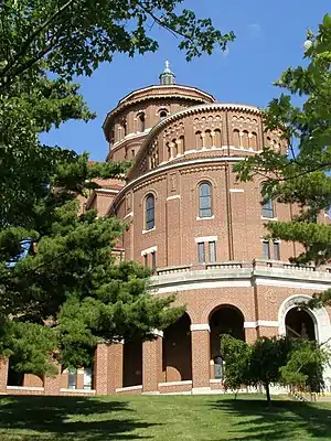Construction on the new monastery, locally known as "the Castle on the Hill", was begun in 1883 on a hill east of Ferdinand known as "Mount Tabor", and completed between 1886 and 1888.[3][4] The first part of the monastery completed was the quadrangle, the sisters' residence. A large addition was added in 1903.