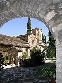 According to an inscription of 1561, the monastery was founded in the 7th century by Emperor Constantine Pogonatos (r. 641–668), to whom the establishment of the Archbishopric of Pogoniani is also attributed.[1] While the seat of the archbishop was indeed at Molyvdoskepastos (then known as Depalitsa or Dipalitsa), the diocese first appears in the Notitiae Episcopatuum during the reign of Andronikos III Palaiologos (r. 1328–1341).[1] Furthermore, the earliest remains in the area date to no earlier than the 11th century (ruined church of St. Demetrios), and the catholicon of the monastery dates to the 13th/14th century.[2]