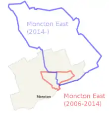 The electoral districts of Moncton East (2006-2014) and Moncton East (2014-) as they relate to the City of Moncton.