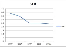 - Every financial institution has to maintain a certain quantity of liquid assets with themselves at any point of time of their total time and demand liabilities. These assets have to be kept in non cash form such as G-secs precious metals, approved securities like bonds. The ratio of the liquid assets to time and demand liabilities is termed as the Statutory liquidity ratio. There was a reduction of SLR from 38.5% to 25% because of the suggestion by Narsimham Committee. As on 9th October 2020, the SLR stands at 18%.[4]