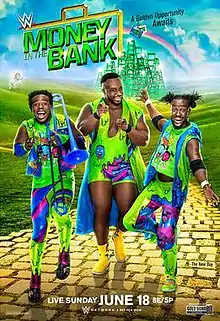 At Backlash, The Usos (Jey and Jimmy Uso) retained the SmackDown Tag Team Championship against Breezango (Fandango and Tyler Breeze) and again in a rematch on the following episode of SmackDown.[9][10] On the May 30 episode, The Usos declared that no team could defeat them. They were then interrupted by The New Day (Big E, Kofi Kingston, and Xavier Woods), making their first appearance on SmackDown since they were moved to the brand during the Superstar Shake-up. A match was then scheduled between the two teams for the titles at Money in the Bank.[4] The following week, after The New Day defeated The Colóns (Primo and Epico), The Usos came out and taunted them, calling The New Day old news.[11] The New Day and Breezango then teamed up and defeated The Usos and The Colóns on the final SmackDown before Money in the Bank.[12]