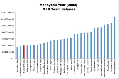 The Oakland Athletics had the third-lowest team payroll in the league (about $40 million) marginally higher than that of the Montreal Expos, whose franchise was transferred to the Washington Nationals in 2005.