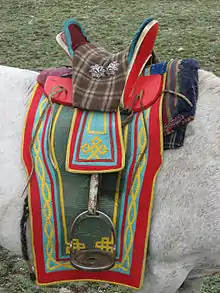 Mongolian tack differs from Western tack in being made almost completely of rawhide[10] and using knots[26] instead of metal connectors. Tack design follows a "one size fits all" approach, with saddles, halters, and bits all produced in a single size. Mongolian tack is very light compared to western tack.[10] The modern Mongolian riding saddle is tall, with a wooden frame and several decorated metal disks that stand out from the sides. It has a high pommel and cantle and short stirrups. Riders frequently stand in the stirrups while riding.[27]