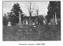 The congregation traces its history back to 1828, when Issac Monnett held services in his own home. [2] The original chapel was built in 1849 by Jeremiah Monnett, a relative of Mary Monnett Bain.[3][4] It had between 12 and 17 members during the 1890s. That number dropped to 6 in the year prior to the completion of the new chapel.