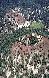 Basaltic andesite lava built the Red Cones, two small cinder cones 6.2 miles (10 km) southwest of Mammoth Lakes, around 8,500 before present.[30] The five Mammoth Mountain Craters are a set of explosion pits that trend west-north-west for 1.6 miles (2.5 km) near the northern flank of Mammoth Mountain.[30]