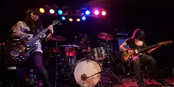 In terms of instrumentation, Mono is a four-piece instrumental rock band. Goto, the group's lead guitarist, uses a 1966 Fender Jazzmaster through Boss, Danelectro, SiB, and Morley effects pedals, into a Fender Twin, a Marshall JCM 2000 head, and a Marshall cabinet for amplification.[22] Yoda, the rhythm guitarist, uses a 1974 Fender Stratocaster through Boss, Tech 21 and Pro Co effects pedals, into a Fender Twin for amplification.[22] Kunishi, the group's bass guitarist, pianist and occasional guitarist uses a 1966 Gibson EB-3 through Boss, TC Electronic, and Tech 21 effects pedals, into an Ampeg B2-R head and a Sunn bass cabinet, as well as a Fender Rhodes, and a Fender Jazzmaster.[22] Takada, the drummer, uses a four-piece 1970s Ludwig drum kit, with Zildjian, Sabian, and Paiste cymbals, as well as a Korg microKORG synthesizer.[22]