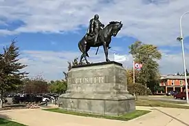 In 1910, President William Howard Taft and the widow Elizabeth Bacon Custer unveiled an equestrian statue of Custer, which now stands at the corner of Elm Avenue and Monroe Street.[13][14] Custer is also honored in street names, various historic markers, buildings, schools, and the regional Custer Airport.[15] City limit signs for Monroe describe the city as "the home of General Custer."