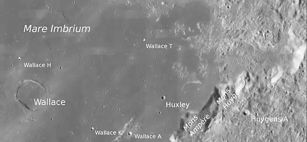 Mons Huygens is the Moon's tallest mountain (but not its highest point,[1] which is Selenean Summit). It is about 5,500 m (18,000 ft) high and is located in the Montes Apenninus.[1] Adjacent to the west is Mons Ampère. The Montes Apenninus were formed by the impact that created Mare Imbrium. The mountain was named after the Dutch astronomer, mathematician and physician Christiaan Huygens.[2]
