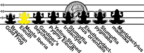 The Monte Iberia eleuth (Eleutherodactylus iberia), also known as the Monte Iberia dwarf frog, is a species of eleutherodactylid frog. It is critically endangered and endemic to rainforest in a small part of easternmost Cuba.[1][3] It is the smallest frog in the Northern Hemisphere and the third smallest frog in the world, at about 10 mm (0.4 in) in snout–to–vent length (only a few members of the Southern Hemisphere genera Brachycephalus, Mini, Paedophryne and Stumpffia are smaller).[4][5][6]