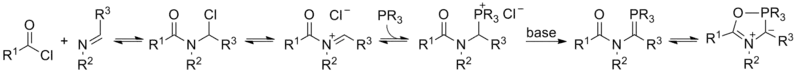 Montréalones are related to Wittig reagents and can be generated in a similar fashion. Reaction of organophosphorus(III) compounds with N-acyliminium ions affords phosphonium salt intermediates which are deprotonated using non-nucleophilic bases (e.g. DBU, LiHMDS). N-Acyliminium ions are generated in situ from acid chlorides and imines such that the '1,3-dipole' itself is generated in a multi-component reaction. The most efficient phosphorus(III) precursor for dipole synthesis is 2-phenylbenzo[d][1,3,2]dioxaphosphole [PhP(catechyl)] owing to the balance of nucleophilicity and electrophilicity that it affords.[3]