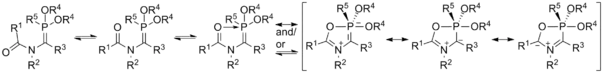 Theoretical and experimental analysis of stable montréalones reveals overlapping azomethine ylide and Wittig-type moieties within the unsaturated 5-membered organophosphorus ring system. Depending on the phosphorus substituents, ring-chain valence tautomerism allows montréalones to display variable degrees of equilibrium and structural blending with N-acyl amino phosphonium ylide forms. The cyclic 1,3-dipolar form is detectably or exclusively formed with phosphite and phosphonite-based analogs. Triphenylphosphine-based variants lack sufficient tendency for intramolecular cyclization, and exist as acyclic phosphonium ylides.[1][2][3][4]
