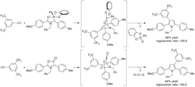 Cycloaddition reactions of asymmetric 1,3-dipoles and dipolarophiles can lead to isomeric product mixtures, particularly with münchnones and alkynes in the synthesis of pyrroles.[10][11][12] In contrast to related Diels-Alder reactions, rationalization of regioisomeric bias using conventional frontier molecular orbital (FMO) theory fails. The complementary use of montéalones and münchnones allows product mixtures to be avoided and highlights the need to consider transition-state geometrical changes (distortion) in the rationalization process.[13]