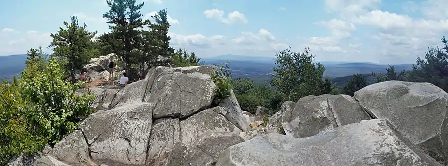 Monument Mountain is the name of a popular 503-acre (204 ha) open space reservation located in Great Barrington, Massachusetts on the southeast side of Monument Mountain. The reservation is centered on the 1,642 feet (500 m) subordinate summit of Peeskawso Peak. It is managed by The Trustees of Reservations, a non-profit conservation organization and is notable for its expansive views of the Housatonic River Valley, The Berkshires, the Taconic Mountains, and the Catskill Mountains of New York from the knife-edge summit of Peeskawso Peak. Monument Mountain, composed of erosion resistant quartzite, is of The Berkshires geology. The reservation receives more than 20,000 visitors a year.