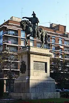Entrusted to the municipal architect Constantino Marzo,[3] works in the 7.5 m high pedestal took place in 1878.[2] In October 1882 the design of the equestrian statue was awarded to the Vallmitjana brothers from Barcelona, Venancio and Agapito, although the former renounced, leaving only Agapito.[4] The wood model of the statue was delivered in 1886,[4] and moved from Barcelona to Valencia in pieces.[5] The bronze employed for the 5.20 m high statue,[6] was obtained from unused cannons from the Castle of Peñíscola provided by the Ministry of War.[4] The monument was unveiled on 20 July 1891.[7]
