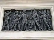 The bronze statue on a top of a high column (10 meters) of lioz stone was made of 5 tons of bronze by Célestin Anatole Calmels (sculpture) and Joaquim da Costa Lima (architecture). The column features two-sided pedestal stands which depict the delivery of Pedro’s heart to the representatives of Porto and landing at Mindelo where Pedro IV gave the flag to Tomás de Melo Breyner. These two low-reliefs were originally made of Carrara marble, and they have been replaced with bronze duplicates for protection purposes. The coats of arms of Bragança and Porto have been depicted on the front and back sides of the column and surrounded with oak and bay leaves.[1][2]