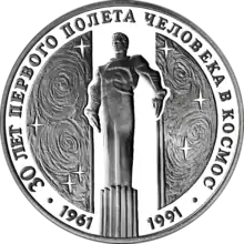 The monument to Yuri Gagarin is depicted on the reverse side of a non-circulating 1 oz silver 3 Rouble coin. This coin was minted in 1991 to honor the 30th anniversary of human spaceflight. An image of the monument is depicted on the back side of the coin, along with the words (in Russian) "30 years of human spaceflight". [6]