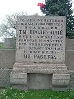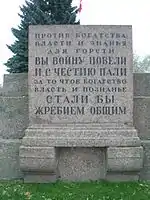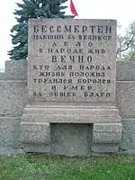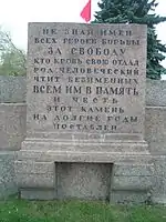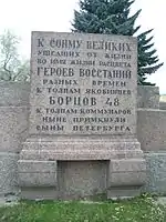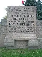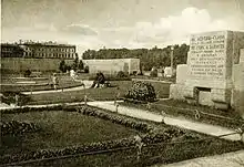 The layout of the square was further developed following the installation of the monument, with gardens and pathways to the design of Ivan Fomin.[1] The redesign was completed in 1921, and on 25 October the square was transferred to the city's Garden and Park Administration. In 1922 the Comintern and the All-Russian Central Executive Committee proposed creating a monument to the October Revolution, but the project was never carried out.[1] The last burial on the square, that of the secretary of the Leningrad city committee of the CPSU Ivan Gaza, took place on 8 October 1933.[1][4] The graves are marked with granite plaques, some with a single name, others with multiple names. Another plaque states "Here are buried those who died in the days of the February Revolution and the leaders of the Great October Socialist Revolution who fell in battles during the Civil War".[4]