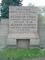 The burials of the dead of the February Revolution started a trend for the Field of Mars to become a pantheon of those who died in the service of the revolution and the achievement of Soviet power.[2] The first individual burial, that of V. Volodarsky, took place on 23 June 1918. Volodarsky, a member of the Presidium of the All-Russian Central Executive Committee, had been assassinated three days earlier.[1] Other interments that year included Moisei Uritsky, chairman of the Petrograd Cheka who was assassinated in August 1918, and Semyon Nakhimson, who was killed in the Yaroslavl Uprising in July 1918.[1][9] Further burials took place later that year, when a number of the dead of the October Revolution were interred.[1] On the first anniversary of the October Revolution the Field of Mars was renamed the "Victims of Revolution Square" and was sometimes called "The Square of the Graves of the Victims of the Revolution."[1][4] Individual burials continued over the next few years, with the Civil War commander A. S. Rakov in 1919 and All-Russian Central Executive Committee member Semyon Voskov in 1920.[1][4] Other communal interments were the eight members of the Finnish Communist Party killed in the Kuusinen Club Incident in 1920, seven officers of the 3rd Petrograd Rifle Regiment killed when the regiment defected in 1919, and four members of the Latvian Riflemen killed during the Yaroslavl rising in 1920.[10][11][12]
