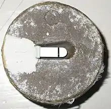 The moo box consists of a block and a bellows . The bellows is sealed to the bottom of the box and to the block. The block is heavy and perforated, and used to actuate the bellows, producing the sound.