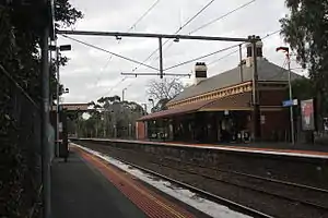 The station building on Platform 1 was provided in 1882, with a signal box provided in 1889, to control interlocked gates at the Puckle Street level crossing, until they were replaced with boom barriers in 1969.[3]