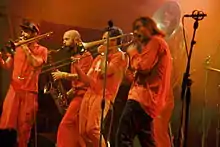 Moop Mama was founded in 2009 at the initiative of the saxophonist Marcus Kesselbauer, as a group of seven brass players, two percussionists and a rapper.[1] Kesselbauer is also the band's composer and arranger.[2] Their first "public rehearsal" was at Munich's Englischer Garten in 2009.[1] They became recognized for many short unannounced concerts in public space (Guerilla-Konzerte), such as pedestrian areas and parks, using a megaphone to amplify the rapper's voice. Sometimes the concerts were regarded as unwanted noise (Ruhestörung), causing conflicts with the police.[2]