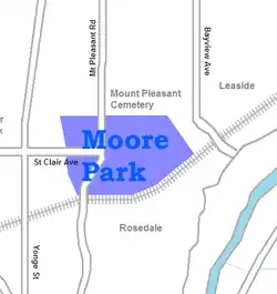 Moore Park is a neighbourhood in Toronto, Ontario, Canada. It is one of Toronto's most affluent neighbourhoods. Toronto Life ranked the Rosedale-Moore Park neighbourhood as the best neighbourhood to live in Toronto.[1] It lies along both sides of St. Clair Avenue East between the Vale of Avoca ravine and Moore Park ravine (formerly Spring Valley ravine). The northern boundary is Mount Pleasant Cemetery and the southern the Canadian Pacific Railway tracks.