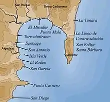 Gibraltar's Islamic history began with the arrival of Tariq ibn-Ziyad on 27 April 711 at the start of the Umayyad conquest of Hispania. Traditionally, Tariq was said to have landed on the shores of the Rock of Gibraltar, which was henceforth named after him (Jabal Ṭāriq (جبل طارق), English: "Mountain of Tariq" – a name which was later corrupted into "Gibraltar" by the Spanish).[1] However, according to one early Islamic account, Tariq "cast anchor close to a mountain which received his name", rather than actually landing at Gibraltar. Another account, by the 9th-century Egyptian historian Ibn 'Abd al-Hakam, describes Gibraltar as lying between the points of departure and disembarkation rather than being the actual landing place.[2] According to this account, the possibly legendary Julian, Count of Ceuta – an ally of Tariq who was estranged from Roderic, the Visigothic king of Hispania – transported the Muslim forces in ships which "in no way seemed different from" those which "plied across the Strait for trade."[3] Spanish accounts corroborate this with the detail that the invasion force was transported "in merchant ships that the reason for their crossing should not be apperceived."[3] Gibraltar would have been a poor place to land due to its relative isolation and difficult rocky terrain, and it is more likely that Tariq either landed in the vicinity of the former Roman colony of Carteia at the head of the Bay of Gibraltar[4] or on the Alboran coast north of Gibraltar around La Tunara (now a barrio of La Línea de la Concepción in Spain), where a landing would have been less conspicuous.[5]