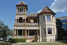 Mary Mayne, widow of Patrick Mayne, had purchased the earlier house and 15 acres (6.1 hectares) in 1876.[2] Patrick Mayne was a prominent Brisbane resident in the 1860s-1870s who owned a butcher shop in Queen Street, served as an alderman of the Brisbane Municipal Council and speculated in property. Mary Mayne and her five children resided in Moorlands Villa until her death in September 1889.[1]