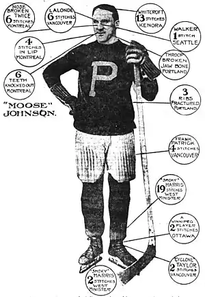 Johnson was the first hockey player to earn the nickname "Moose", and became infamous for his rough style of play – though he was rarely known to be dirty, as contemporaries Sprague Cleghorn and Billy Coutu were.[27] He was the frequent source of injuries on whichever team he played for – while playing for the Portland Rosebuds in 1915, he had his jaw broken, two ribs fractured, two stitches each in his right leg and left ankle, a flattened shin bone and a badly bruised thigh.[29] The prior season with New Westminster, he received seventeen stitches in one shin after it was laid open to the bone by an opposing player's skate,[29] and had his eye loosened in its socket from an especially violent body check.[27] Nevertheless, in tribute to his toughness, Johnson missed only one game in those two seasons.[27]