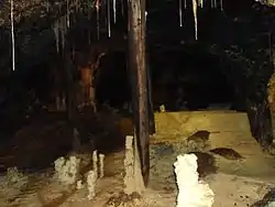 The first recorded mention of the mine dates to 1683, as a source of alum, iron and copper vitriols (sulfates),[1] sulfur, and colored clay. The colours of the stalactites are produced by the minerals in the mine.[2] In 1717 the merchant Johann Leonard Morassi bought the mine and named it Morassina. In 1750 the Leipzig trading firm of Frege bought it and became extremely wealthy from it; in 1816 they were able to buy back the Crown Jewels of Saxony, carried off by Napoleon, from Amsterdam. However, the bottom fell out of the market after chemical methods of synthesizing alum and sulfuric acid were introduced around 1850. The mine was not worked after 1860,[1][3] and was closed up and forgotten. In 1851, miners seeking uranium discovered it and the stalactite formations,[3] but because of its location near the Inner German Border, the East German authorities refused until 1998 to allow it to be opened to visitors. It was finally opened in 1993.[1] There is a mining museum (opened in 1995) and the St. Barbara licensed spa (opened in 1997); radium cures are offered.[4]