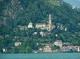 The church of Santa Maria del Sasso was probably built in the 13th century. It was completely rebuilt in 1462 in the style of the Renaissance. In 1758 it was renovated in the Baroque style, while in the 18th century a monumental staircase was added to the front of the church.[4] The church tower was built in the Middle Ages and made taller during the 16th century.[10] The church contains several valuable frescos from the 16th and 17th centuries including one painting that is dated to 1513.[10] The sacramental chapel contains carvings from 1591 and paintings from 1611.[10] In the chapel on the opposite side contains an example of illusionistic architecture painting from the 18th century.