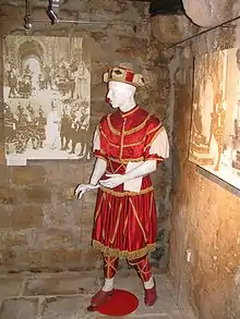 The Moreška in Korčula dates back to at least the mid-17th century,[4][5] with its roots in the Middle Ages, from the several hundred years of battle between Muslims and Christians (Moros y cristianos) in Spain, specially in Catalonia where exist a traditional dance called La Morisca de Gerri de la Sal, during the Reconquista. Multiple European festivals and pageants have their roots from that period.[6] By the 16th century the conquest theme with mock battles was introduced into the Americas and other world areas administered or culturally influenced by Spain. The version that is danced in Korčula appears to be the only one in modern times which uses two swords held by each soldier (Moreškanti) in the elaborate mock battles.
