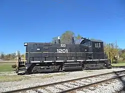![]() LRSX 1201, seen here in 2015 on the Tulsa-Sapulpa Union Railway in Sapulpa, Oklahoma, still faintly bears the Morehead and South Fork logo underneath the cab windows. | |