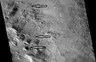 Western edge of Moreux crater, as seen by CTX (camera), on the Mars Reconnaissance Orbiter. Arrows indicate probable glacial moraines. Crater floor is to the right.
