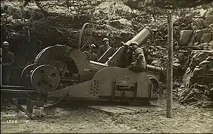 The De Angelis (D.A.) mount consisted of a U shaped cradle which held the trunnioned barrel and a slightly inclined rectangular metal firing platform with a hydro-gravity recoil system. When the howitzer fired two hydraulic buffers at the sides of the platform slowed the recoil of the cradle which slid up a set of inclined rails and then returned the howitzer to position by the combined action of the buffers and gravity. The firing platform had two small wheels at the front and two larger wheels at the rear which rotated on a crescent-shaped steel rail that was fixed to a wooden base and gave 90° of traverse. For transport, the howitzers on De Angelis mounts could be broken down into two wagon loads, one for the howitzer/cradle and another for the metal firing platform. Each was towed by an artillery tractor and then reassembled for use once a spot had been leveled and the wooden firing base had been assembled.[4]