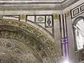 The last part of the interior to have mosaics added were the women's galleries between approximately 1300 and 1330.[1] These show angels and saints and their style agrees with Giovanni Villani's written evidence, which dates their completion to 1330 and probably dates the start of work to around 1300–1315. There are no art historical studies specifically on the mosaics of the women's galleries, though Venturi briefly notes that they were produced after 1300. The vault has a central motif of a starry sky, symbolic of the Empyrean, surrounded by angels with unclear attributes, possibly another set of angelic hierarchies.