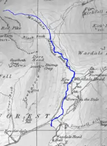 Mosedale Beck rises in Little Scoat Fell, it then flows south west until it reaches Ritson's Force waterfall. It then turns to the south and flows through the hamlet of Wasdale Head. It then flows through Down-in-the-Dale before it empties into Wast Water near the parallel Lingmell Beck.