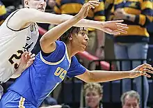 Brown was inconsistent as a freshman, dominating some games while being a nonfactor in others.[14] In the season opener, he scored 19 points on 9-of-10 shooting, including five slam dunks, and had 17 rebounds in a 96–71 win over Purdue Fort Wayne.[15] He was the first UCLA player to have 19 points and 17 rebounds in his college debut since Lew Alcindor, known later as Kareem Abdul-Jabbar.[lower-alpha 1] On November 16, 2018, Brown had 23 points and 14 rebounds in a 95–58 win over Saint Francis to become the first UCLA freshman to record a double-double in his first three games. He nearly had a triple-double with eight blocks in 29 minutes, having left the game for good with around six minutes remaining.[16][17] After facing smaller post players from small-program schools, Brown struggled offensively against Nick Ward of No. 11 Michigan State with only five points, 10 rebounds and three blocks in an 87–67 loss to the Spartans in the Las Vegas Invitational.[18] In the consolation game, UCLA dropped its second straight contest to a top-15 team, losing to No. 7 North Carolina as Brown played just eight minutes before fouling out.[19] On December 2, he had 12 points, 10 rebounds, and three blocks in an 82–58 win over Loyola Marymount. It was his first double-double since the third game of the season, and it came in his first matchup against a fellow 7-footer, the Lions' 7-foot-3-inch (2.21 m) Mattias Markusson.[20][21] On January 26, 2019, Brown snapped out of a two-week slump with 11 points, 15 rebounds and two blocks to help the Bruins end a three-game losing streak in a 90–69 win over Arizona.[22] He missed the regular season finale against Utah due to an unspecified violation of the school's student-athlete code of conduct.[14]