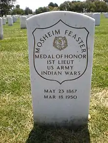 Mosheim Feaster was born in Schellsburg, Pennsylvania on May 27, 1867 to Conrad and Mary Feaster.[1] He enlisted in Company E, 7th Cavalry Regiment, U.S. Army on October 23, 1889 in Cleveland, Ohio.[2][3] Assigned to frontier duty in the Dakota Territory, Feaster took part in campaigns against the Sioux during the late-1880s. His unit was ordered to bring in the Sioux chief Big Foot, on the morning of December 29, 1890, they surrounded his camp on the banks of Wounded Knee Creek. Although intending to place Big Foot under arrest and disarm his followers, fighting broke out resulting in what was then called the Battle of Wounded Knee. Feaster was cited for "extraordinary gallantry" during the battle by advancing to an exposed position and holding it under heavy fire. He was one of twenty soldiers who received the Medal of Honor for his actions.[3] Feaster was discharged as a private on June 22, 1893 at Fort Riley, Kansas.[2]