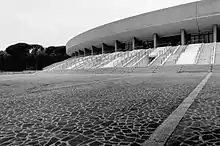 It is one of the best works of the exhibition. It is the first permanent construction of an open theater capable of holding a large mass of spectators, about 12,000. It plays a decisive role for neapolitan rationalist architecture, as it can be considered the first work with rational intentions. It was designed and built between 1938 and 1940, at the age of only twenty-six, by Giulio De Luca who was inspired by the architectural models of Greek and Roman theaters scattered around Magna Graecia. De Luca was able to master his skills as a designer attentive to the problems of an open theater, managing to solve the complex problems of acoustics and visibility of the auditorium by playing on the section and on the internal elevation, creating an interaction of remarkable interest between landscape and architecture. The structure, as a whole, is in counter-slope, this means that the reading of its front is canceled, which is reduced to the crowning pediment. The access level rises eight and a half meters from the ground level and above, a peristyle of pilotis supporting the long curved pediment, 114 meters long, decorated with a mosaic by Nicola Fabbricato. After the Second World War it was damaged, like all the structures of the complex, and subsequently restored for opening in 1952. Over time it fell into decay again due to poor maintenance and the post-earthquake emergency that worsened the conditions. decided in 1989, in agreement with the designer, to demolish the old arena and build a similar one with acoustic and visual improvements. The new arena, bare of the mosaic on the façade, was inaugurated in 2001 with a Bob Dylan concert. In 2015, with a rent of 50,000 euros per year and a percentage of the proceeds, the entrepreneur Floro Flores was awarded the management of the Flegrea Arena for twelve years. Following extensive renovations, from the following summer it hosts the Noisy Naples Fest review which, for the 2018 edition, will bring in concert in Naples, among others, international artists of the caliber of Noel Gallagher with Noel Gallagher's High Flying Birds and Sting.[10]