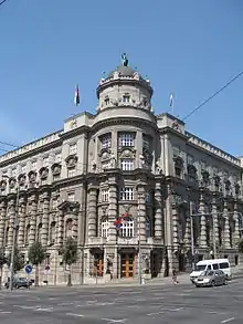 - A statue at the top of the building of the Government of Serbia, of Mother Serbia holding a shield with the Serbian cross.