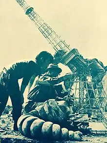 The Tokyo Tower model was built by a metal works company. The tower model was built using blue prints by the Toho effects staff who photographed and researched the real tower. However, the blue prints only showed one side of the tower, which forced the metal works company to figure out the angles to build the other sides.[46] The effects staff had initially requested the original blueprints of Tokyo Tower but were unable to obtain them.[47] Toho closely guarded the custom tower model blueprints to keep competing studios from benefitting from Toho's work.[48] Mothra's silk was created from a form of liquid styrofoam called "expanded Polystyrene".[49] A small model and large model was built for the atomic ray cannon.[50]